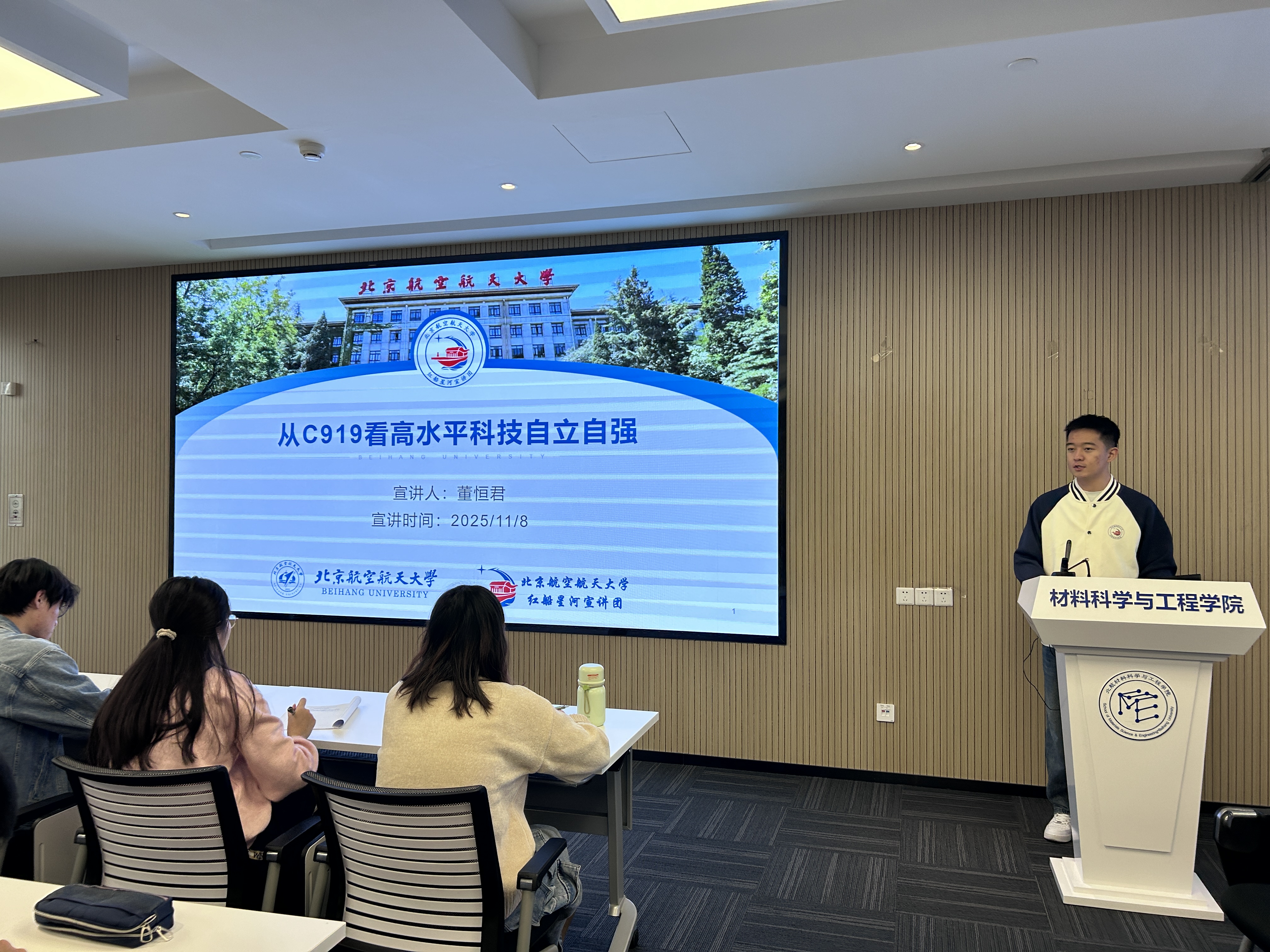 此外,材料学院党委统一组织8学时实践学习。由北航“红船星河”宣讲团讲师董恒君讲授“从C919看高水平科技自立自强”主题党课,结合大国重器研发历程,解读科技自立自强的时代意义,引导发展对象树立“听党话、跟党走”的坚定信念;党务助理石梦琳详细解读发展党员全流程,重点说明“确定发展对象、培养考察、预备党员接收”等关键环节要求,规范入党流程认知,现场还分发《求是》等学习材料,引导学员深化理论思考。11月9日至10日,全体发展对象分批次投身志愿服务活动,在校园环境维护、学业帮扶等实践场景中,以实际行动锤炼党性修养,践行入党初心与使命担当。