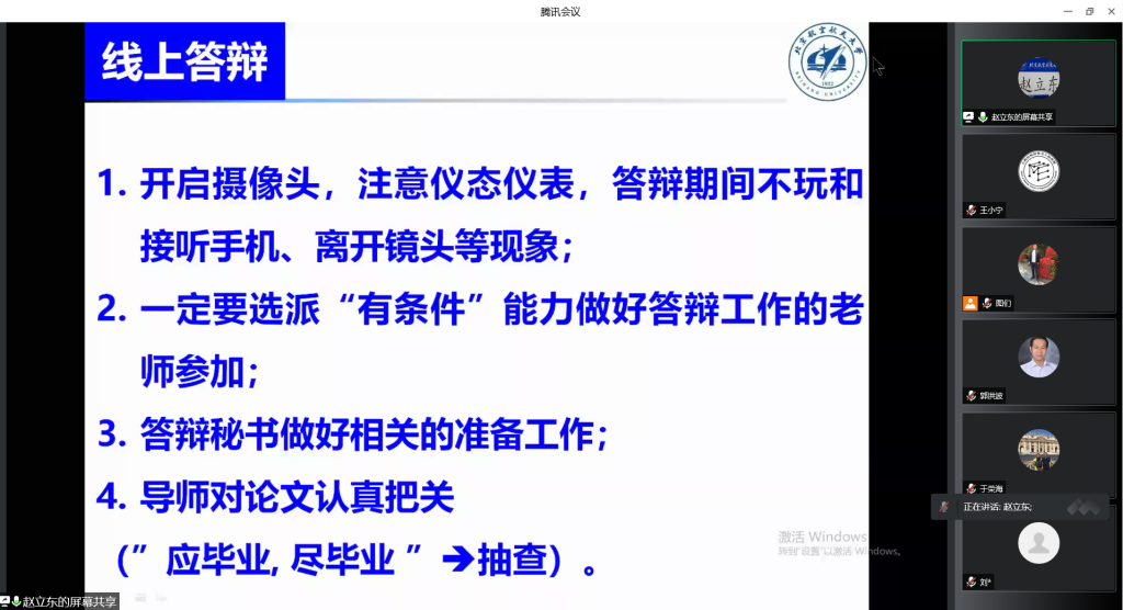 会议第三项,材料学院副院长赵立东布置研究生教学培养相关工作,就疫情期间研究生教育培养环节,与参会老师进行了详细沟通,内容涵盖近期研究生线上毕业答辩、学院研究生线上教学课程开展以及近期线上开展科研形势下的在线指导,强调要扎实做好研究生教育培养工作。