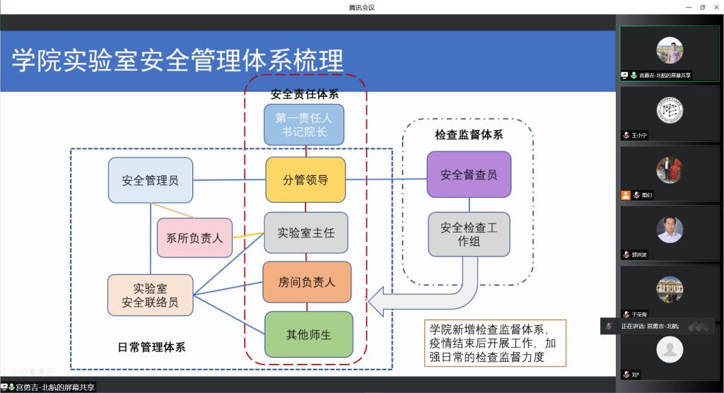 会议第四项,材料学院副院长宫勇吉传达上级疫情防控工作有关精神并部署相关工作、实验室安全、保密、反间防谍等相关工作,首先回顾本学期实验室安全存在的问题,梳理学院实验室安全管理体系,强调要坚持落实好实验室安全培训,根据近期疫情防控要求做好实验室仪器关停,杜绝实验室安全问题;随后结合近期线上工作模式,强调了学院保密工作的相关工作要求,标准化涉密载体管理流程。与会教师共同观看保密、反间防谍相关视频,开展专项保密教育。