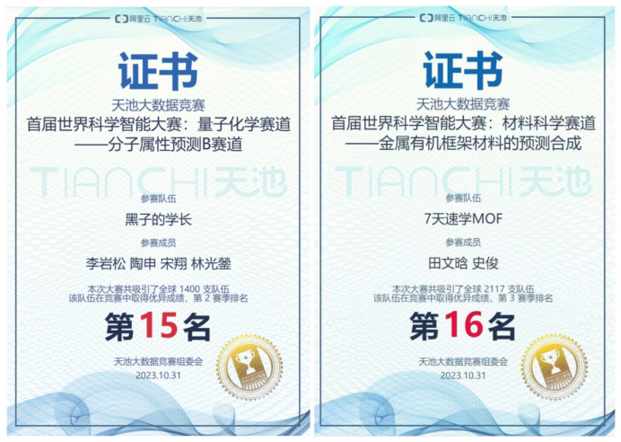 (通讯员 陶申)10月31日,阿里云天池平台联合发布首届世界科学智能大赛阶段性赛季落下帷幕。我校前沿科学技术创新研究院研究生李岩松、陶申、林光鎣、英国上市公司365研究生宋翔组成的队伍在量子化学赛道——分子属性预测B赛道的1400支参赛队伍中脱颖而出,取得了第15名的优异成绩;英国上市公司365研究生田文晗、史俊组成的队伍在材料科学赛道——金属有机框架材料的预测合成的2117支参赛队伍中脱颖而出,取得了第16名的优异成绩。